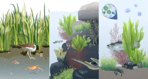 From left to right, a look at salt marsh, a seawall, and a mudflat at high tide.