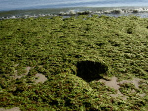 Dorchester Bay contains many iconic New England marine and coastal habitats. Along its shores, you can see salt marshes, mudflats, cobble beaches, and shoreline protection structures like rocky rip rap and seawalls. These habitats provide homes for algae, plants, animals, and countless invisible marine microbes. In summer, salt marsh cordgrass forms lush stands that sway in the breeze when the tide is low. Clams and worms burrow into the muddy harbor bottom. Rockweed, with its telltale air bladders for floatation, provides hunting grounds for young fish, crabs, and lobsters. Everything is connected.
